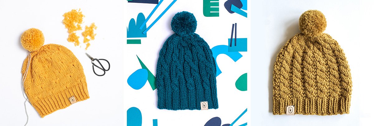 The January 2026 Hat, Callisto, is a stunner! The design features a tubular cast on, beautiful XO cables, and intricate crown decreases. A pom pom tops it all off and a custom KW tag completes the look. Click the button below to grab your kit!